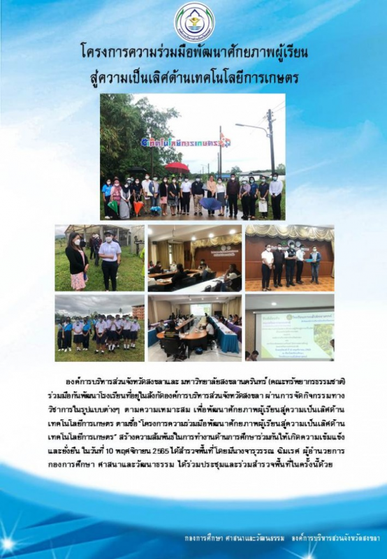 องค์การบริหารส่วนจังหวัดสงขลาและ มหาวิทยาลัยสงขลานครินทร์ (คณะทรัพยากรธรรมชาติ) ร่วมมือกันพัฒนาโรงเรียนที่อยู่ในสังกัดองค์การบริหารส่วนจังหวัดสงขลา ผ่านการจัดกิจกรรมทางวิชาการในรูปแบบต่างๆ ตามความเหมาะสม เพื่อพัฒนาศักยภาพผู้เรียนสู่ความเป็นเลิศด้านเทคโนโลยีการเกษตร ตามชื่อ“โครงการความร่วมมือพัฒนาศักยภาพผู้เรียนสู่ความเป็นเลิศด้านเทคโนโลยีการเกษตร” สร้างความสัมพันธ์ในการทำงานด้านการศึกษาร่วมกันให้เกิดความเข้มแข็งและยั่งยืน ในวันที่ 10 พฤศจิกายน 2565 ได้สำรวจพื้นที่ โดยมีนางจารุวรรณ ฉิมเรศ ผู้อำนวยการ กองการศึกษา ศาสนาและวัฒนาธรรม ได้ร่วมประชุมและร่วมสำรวจพื้นที่ในครั้งนี้ด้วย